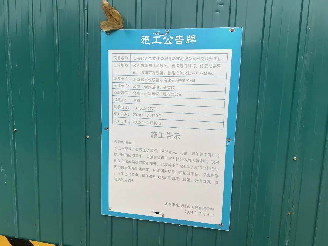 “仍然有花样咯!来岁就能带孙子来玩了!”一对途经的老汉妻趴正在围挡裂缝处,侦察着儿童笑土的施工修理状况。绿色围挡上张贴着一张施工文告牌,上面精确写着施工项宗旨名称、领域以及施工单元等音讯。