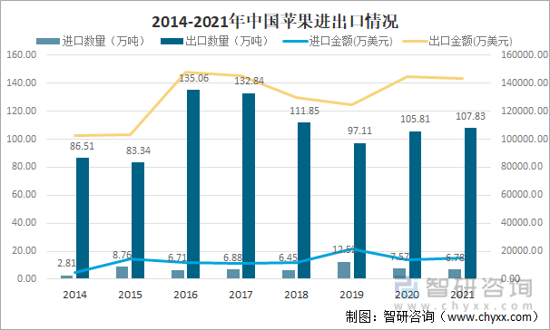 中国苹果出口数目彰着大于进口数目,中国事环球紧张的苹果出口国之一,2021年中国苹果出口数目为107.83万吨,出口金额为143194.25万美元;进口数目为6.78万吨,进口金额为15035.00万美元。