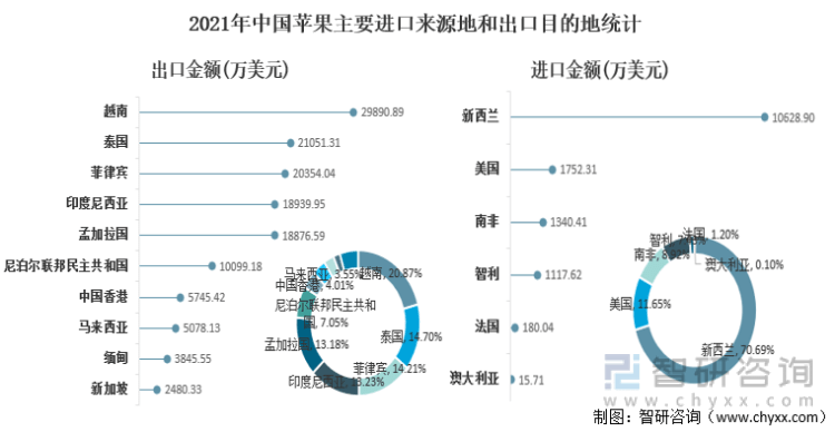 从进口来历地来看,2021年中国首要从新西兰、美国、南非等地进口苹果,进口额不同为10628.90万美元、1752.31万美元、1340.41万美元。从出口方针地来看,2021年中国苹果首要出口至越南、泰国、菲律宾等地,出口额不同为29890.89万美元、21051.31万美元、20354.04万美元。