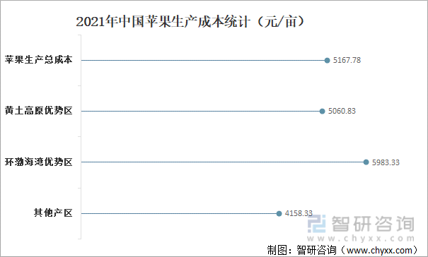 2021年世界苹果临蓐总本钱均匀为5167.78元/亩,比2020年上升2.77%。此中,黄土高原上风区临蓐总本钱均匀为5060.83元/亩,比2020年上升2.82%;环渤海湾上风区临蓐总本钱为5983.33元/亩,比2020年上升2.28%;其他产区临蓐总本钱为4158.33元/亩,比2020年上升4.18%。