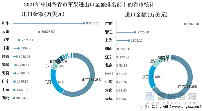 分省市来看,2021年山东苹果出口额实现83407.26万美元,占世界苹果出口总额的58.25%杏彩体育官网登录,世界排名第一;云南苹果出口额实现30676.97万美元,占世界苹果出口总额的21.42%,世界排名第二;辽宁苹果出口额实现7275.84万美元,占世界苹果出口总额的21.42%,世界排名第三。从进口情形来看,2021年广东苹果进口额为9961.50万美元,占世界苹果进口总额的66.26%,世界排名第一;浙江苹果进口额为2726.00万美元,占世界苹果进口总额的18.13%,世界排名第二;上海苹果进口额为1802.12万美元,占世界苹果进口总额的11.99%,世界排名第三。