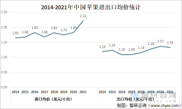 从进出口均价来看,中国苹果进口均价彰着高于出口均价,2021年中国苹果进口均价为2.22美元/千克,较2020年增长了0.39美元/千克;出口均价为1.33美元/千克,较2020年删除了0.04美元/千克。